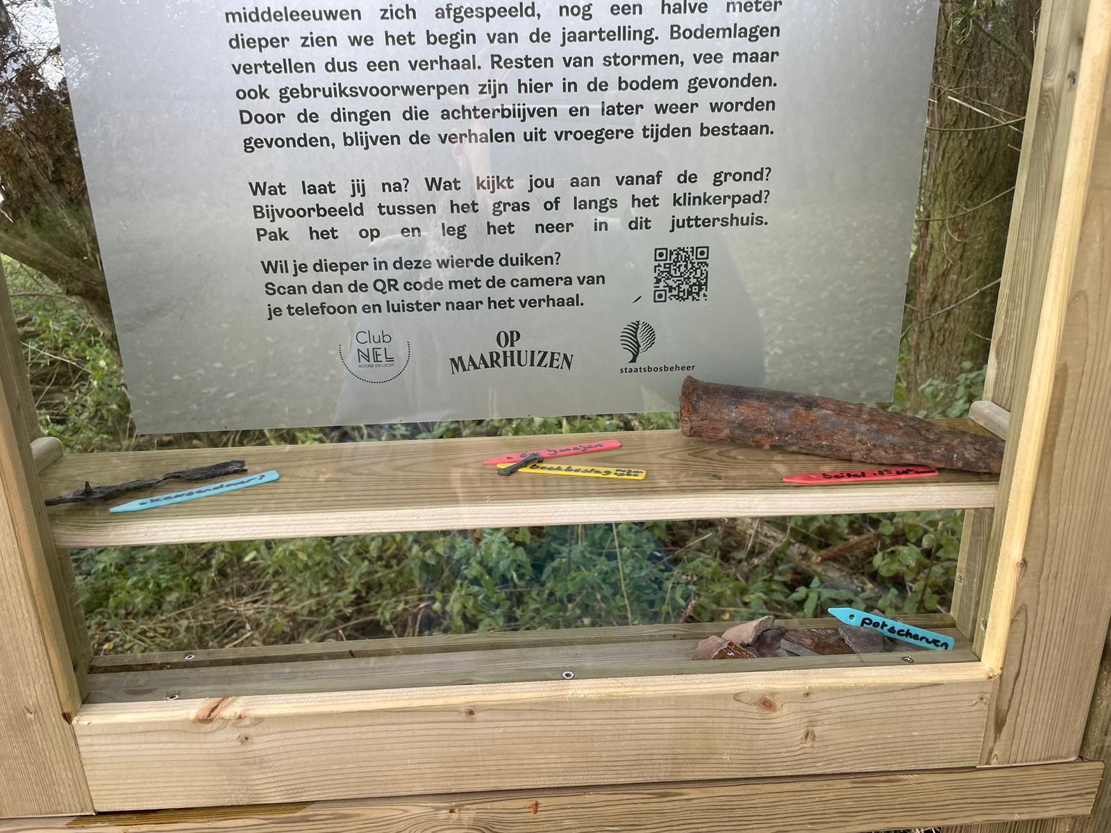 'Onder je voeten ligt een rijke geschiedenis aan natuur en cultuur verscholen. Door grondboringen blijkt dat het landschap niet alleen iets is wat je om je heen ziet, maar dat de geschiedenis en de opbouw van het landschap zichtbaar is in bodemlagen. Op een halve meter diepte hebben de middeleeuwen zich afgespeeld, nog een halve meter dieper zien we het begin van de jaartelling. Bodemlagen vertellen dus een verhaal. Resten van stormen, vee maar ook gebruiksvoorwerpen zijn hier in de bodem gevonden. Door de dingen die achterblijven en later weer worden gevonden, blijven de verhalen uit vroegere tijden bestaan.'